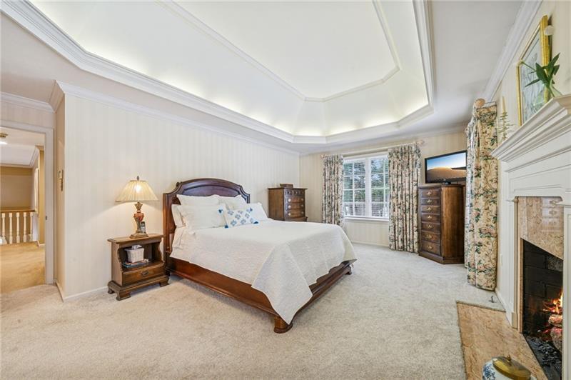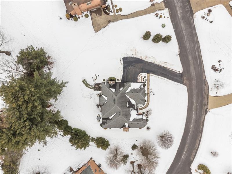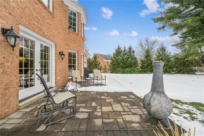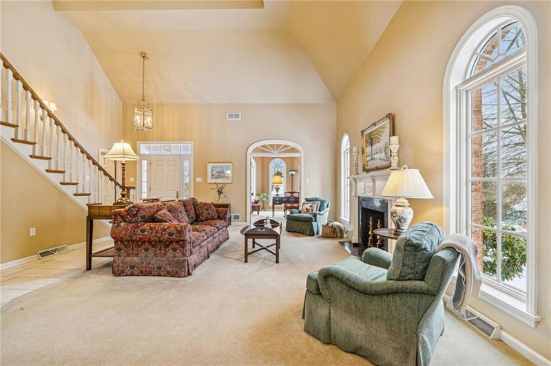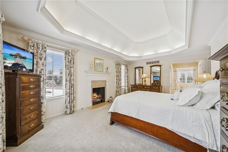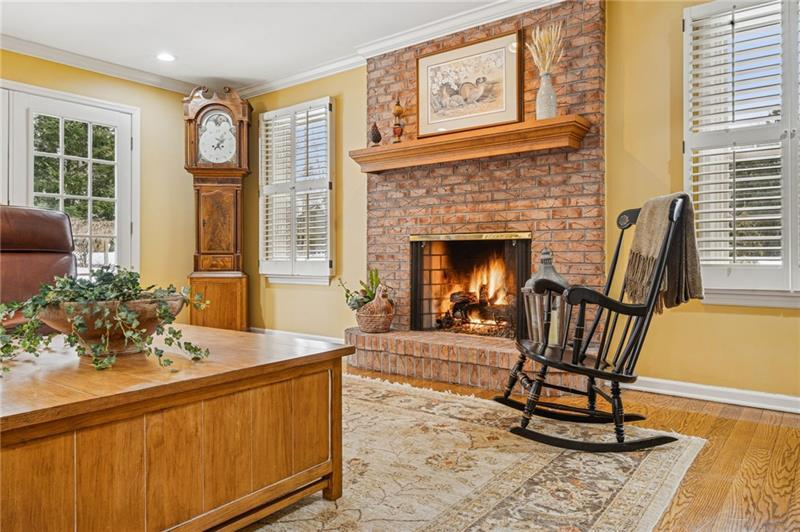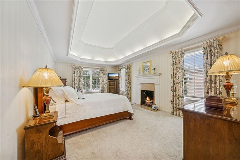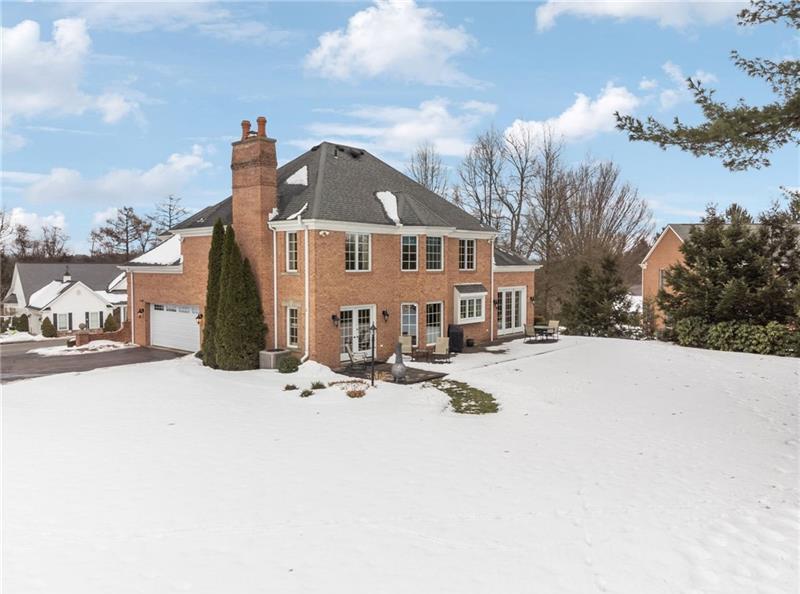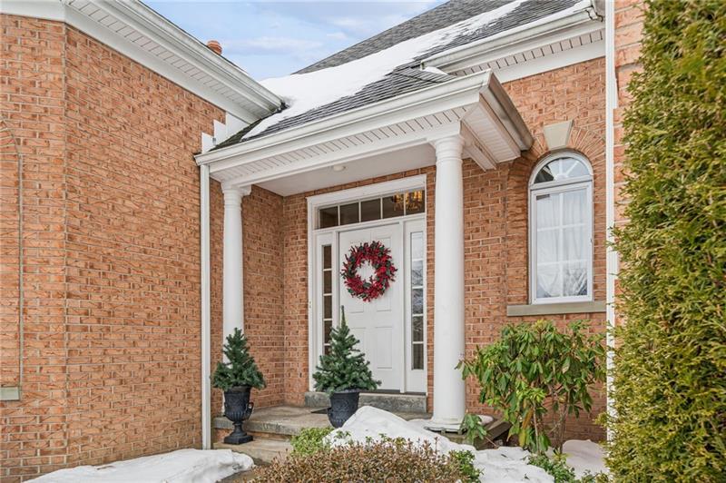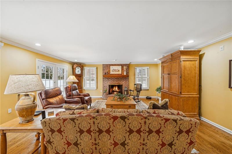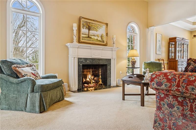 Welcome home to this stunning Pellis built all-brick 3-bedroom, 2.5-bath residence offering elegant living spaces. Step through the welcoming front door into the entryway with travertine tile floors and then on to the grand living room featuring soaring ceilings and a cozy gas marble fireplace, perfect for both relaxation and entertaining. The formal dining room impresses with tray ceilings, custom window treatments, and French doors that open to a level backyard, ideal for outdoor gatherings. A den with Palladian-style windows and a vaulted ceiling adds charm and light throughout the home. The French country kitchen boasts a gas cooktop, desk area, wood floors, and a breakfast area with large windows overlooking a stone patio, filling the room with warmth and natural light. Gather in the family room, where the gleaming hardwood floors continue and a second gas fireplace creates an inviting retreat. Upstairs, the luxurious primary suite offers an additional marble fireplace for cozy winter evenings and mornings, tray ceilings, two walk-in closets, and an oversized spa bath complete with a Jacuzzi tub, separate shower, and dual vanities. Two additional bright and airy bedrooms share a well-appointed full bath with tub and separate shower. With three fireplaces, thoughtful architectural details, and timeless finishes, this remarkable home exudes a stately yet comfortable elegance perfect for gracious living.
